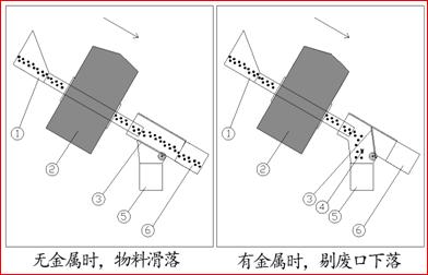工作過程:原料①以斜落體方式經過檢測線圈②,檢測到金屬則立即啟動分離擋板③,將含有金屬顆粒原料④從廢料口⑤排除。