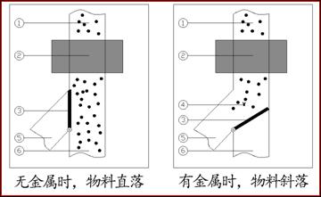 工作過程:原料①以下落體方式經(jīng)過檢測線圈②,檢測到金屬則立即啟動分離擋板③,將含有金屬顆粒原料④從廢料口⑤排除。