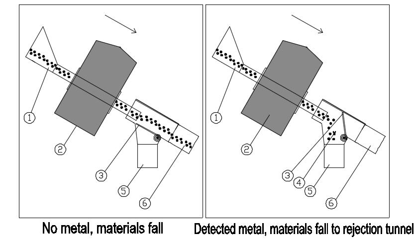 Working Process: Material ① falls and goes through inclined detect coil ② metal impurities is detected and separation flap ③ is actuated