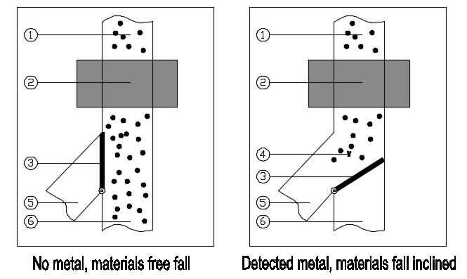 Working Process: Material ① falls and goes through detect coil ② metal impurities is detected and separation flap ③ is actuated